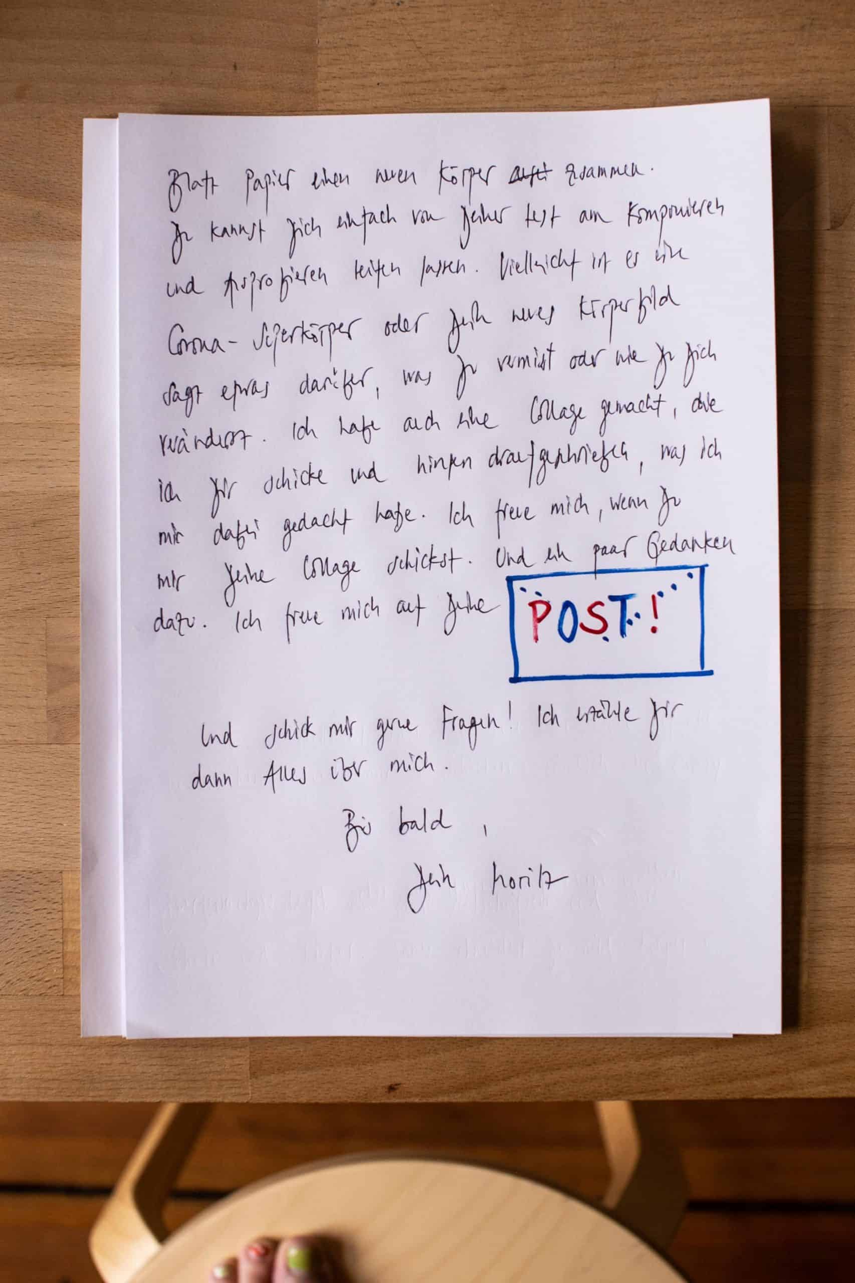 It’s still completely unclear in what ways Corona will change our world. To think about this together, in particular with children and young people, is an important social task. Choreographic work allows the participants to playfully experience the physical, gestural, and performative level of changes and new structures. At the same time, dance and choreography are particularly dependent on shared experience, on gathering and physical proximity. In the spring and summer of 2020, this wasn’t possible. Frischkorn and Pritzel’s letters thus represent the attempt to establish contact with the help of the old, analogous, and material medium of the letter. This requires a choreography of its own, a choreography of drawing, writing, packaging, carrying, reading, trying out. It is the attempt to carry on physical affection even over distance. The fact that this is not merely about posting something, but rather about the creation of commitment via mail, appears to be a programmatic and conscious decision. For who knows, perhaps the crisis will also bring old forms and ways of communication to light again. This would contrast the algorithmic control of movement with the diverse and discrete postal channels, and, in our attempts to return to normal, put special attention on the physical changes and needs that became obvious during the crisis.
