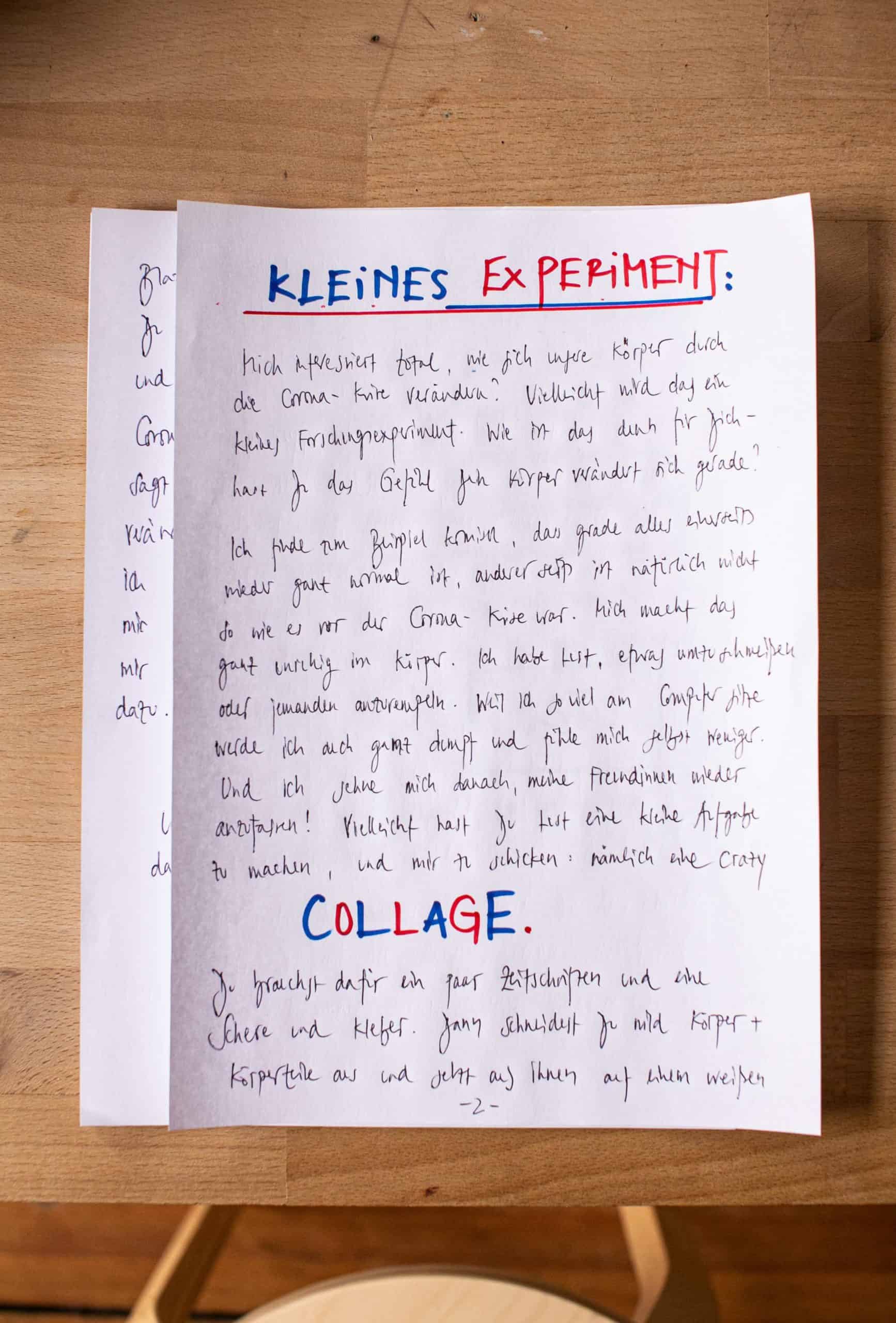 Noch ist ganz unklar, auf welche Art und Weise Corona unsere Welt verändern wird. Darüber gemeinsam nachzudenken, auch mit Kindern und Jugendlichen, ist eine wichtige gesellschaftliche Aufgabe. Choreographisches Arbeiten kann dabei besonders die körperliche, gestische und performative Ebene von Veränderungen und neuen Strukturen spielerisch erfahrbar machen. Zugleich sind Tanz und Choreographie in besonderem Maße von der geteilten Erfahrung, von Versammlung und physischer Nähe abhängig. Im Frühjahr und Sommer 2020 war das nicht möglich. Die Briefe von Frischkorn und Pritzel stellen den Versuch dar, mit Hilfe des alten, analogen und materiellen Mediums des Briefes Kontakt herzustellen. Dafür bedarf es einer eigenen Choreographie, einer Choreographie des Zeichnens, Schreibens, Verpackens, Tragens, Lesens, Ausprobierens. Es ist der Versuch, körperliche Affektion auch über die Distanz fortzuführen. Dass dabei nicht einfach gepostet wird, sondern postalisch Verbindlichkeit entsteht, scheint eine Setzung und bewusste Entscheidung zu sein. Denn wer weiß, vielleicht bringt die Krise auch wieder alte Formen und Wege der Kommunikation zutage. Der algorithmischen Kontrolle von Bewegung stünde dann der mannigfaltige, diskrete Postweg gegenüber, der Rückkehr zur Normalität eine besondere Aufmerksamkeit für die körperlichen Veränderungen und Bedürfnisse, die in der Krise deutlich wurden.