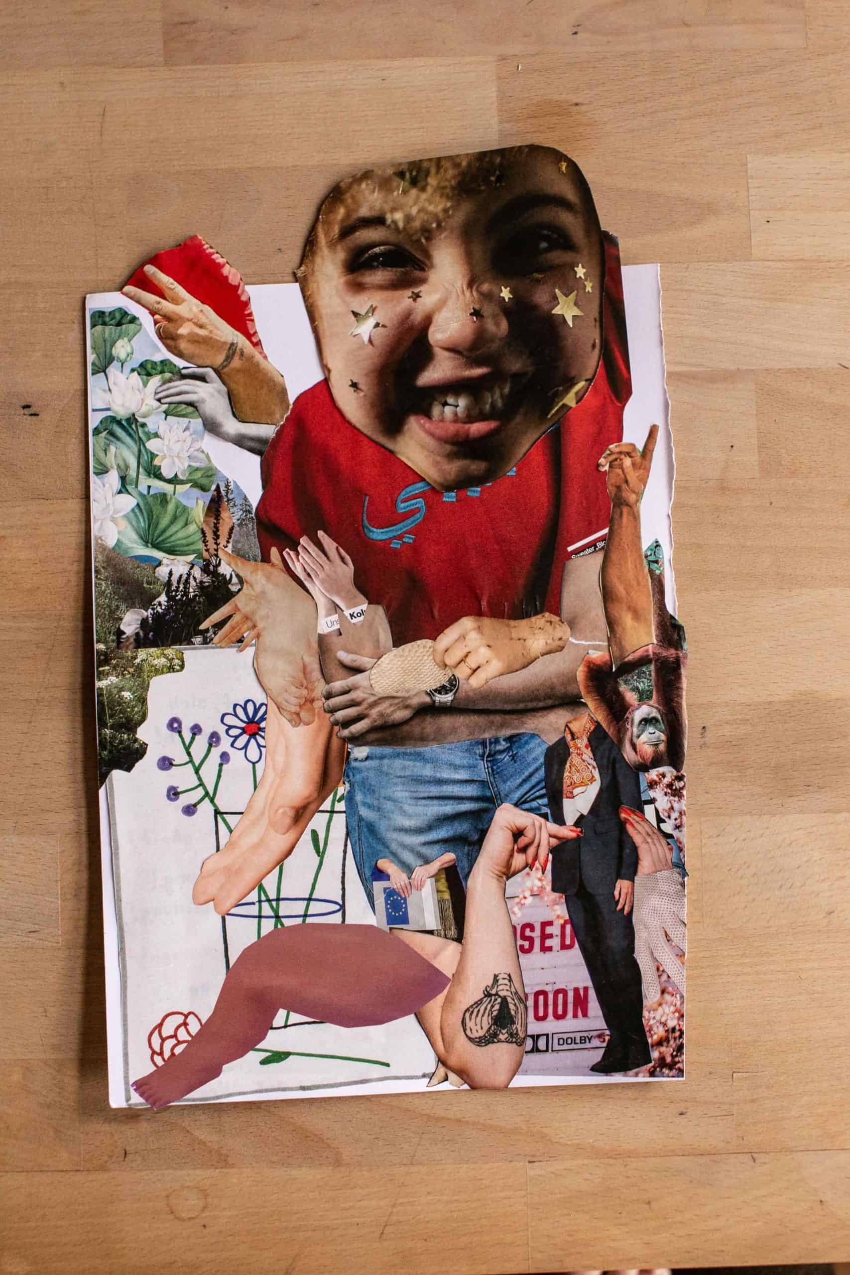 Für die erste Aufgabe arbeitet Frischkorn mit dem Medium der Collage. Diese künstlerische Ausdrucksform, die u.a. eine Tradition als queere Kunstform hat, regt dazu an, sich über das eigene Körperbild Gedanken zu machen. Inspiriert von bereits bestehendem Bildmaterial, treffen die Jugendlichen Entscheidung darüber, welches Material sie verwenden wollen, sie ordnen die Bilderausschnitte an, arrangieren sie räumlich, und sortieren sie nach Farben und Formen. Dabei geht es einerseits darum, sich zu bestehenden Körperbildern zu verhalten, gleichzeitig ist eine Collage die Einladung, sich ein neues Bild des eigenen Körpers zusammenzusetzen.